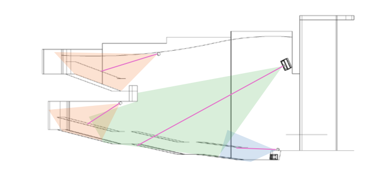 为了保证视线,主要扬声器通常必须保持在一楼后座听众的“蓝色”视线之上(或扬声器可能遮挡舞台视线的任何位置)。