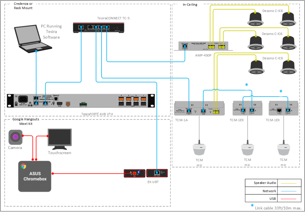 注意:需要其它非 Biamp 设备,如 控制网络交换机、无线话筒、扬声器和 Google Hangouts Meet Kit 硬件。