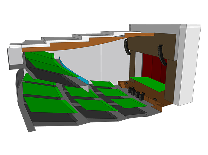 该系统设计模板描述了具有阶梯坐席和眺台的剧院的两种不同的扬声器系统设计的其中一种。这个设备齐全的表演场地可承接当地,区域和国家级表演。这是一个中型表演艺术大厅,在第一层提供宽敞的坐席,并提供额外的眺台座位。