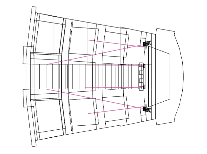 IV6模块化垂直阵列能提供线性的指向特性。两串IV6线阵列和舞台边缘排列的前补声扬声器可覆盖场内所有的坐席。虽然从任何座位都能看到整串线阵列阵,但可能需要为第一层的最后一排进行补声。将超低扬声器编组在一起,可以用较少的扬声器数量获得更高的音量输出。